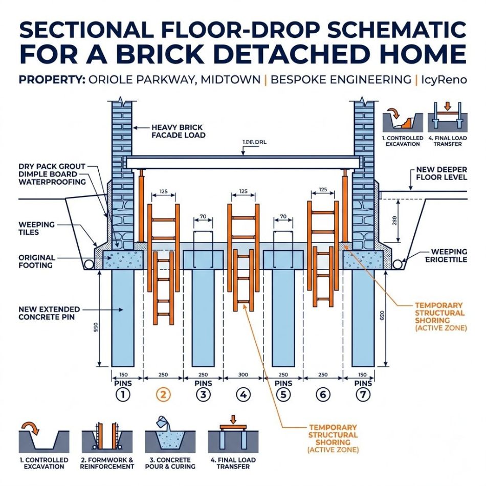 Midtown Toronto, specifically along Oriole Parkway, is renowned for its classic, heavy brick detached homes. While these properties offer stunning architectural details above ground, they frequently suffer from cramped, shallow cellars. The homeowners wanted to unlock the full potential of their home by creating a deep, functional living space, but the massive weight of the century-old brick masonry meant that a rapid, large-scale dig was far too dangerous and could compromise the entire structure.