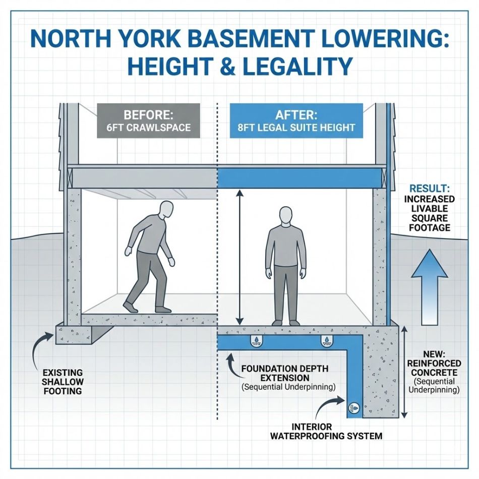 The homeowners of this North York property wanted to convert their basement into a legal rental suite. However, they faced a common obstacle in this neighborhood: the original basement ceiling height was barely 6 feet. This “crawlspace” feel made the area dark, cramped, and legally non-compliant for a separate dwelling unit. To maximize the property’s value and rental potential, they needed significant vertical expansion without altering the home’s exterior.