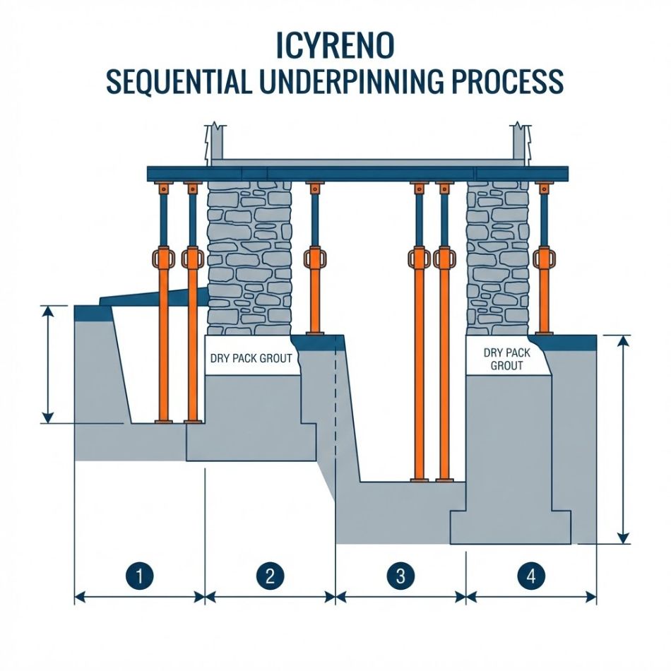 - Sequential Excavation & Shoring: Divided the foundation perimeter into mathematically controlled sections (pins). We excavated beneath the existing walls in alternating phases while installing temporary steel shoring to safely distribute the house load.